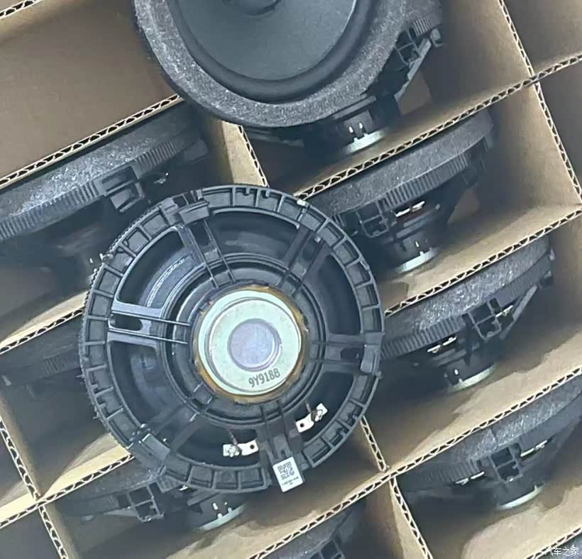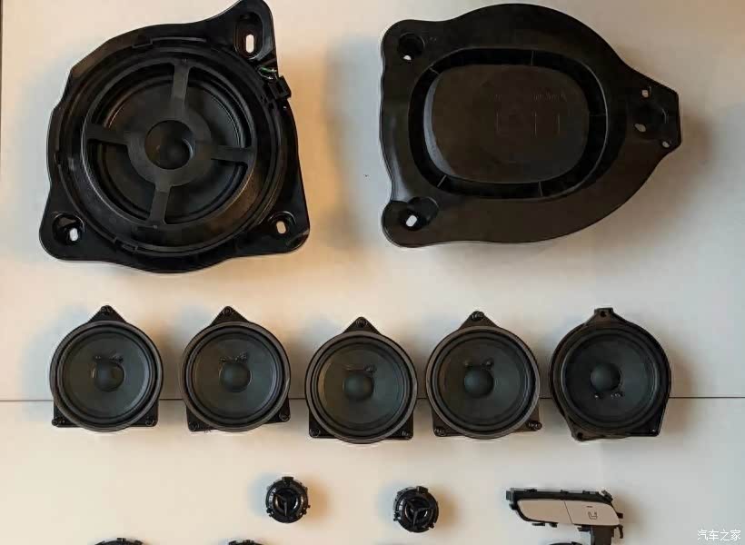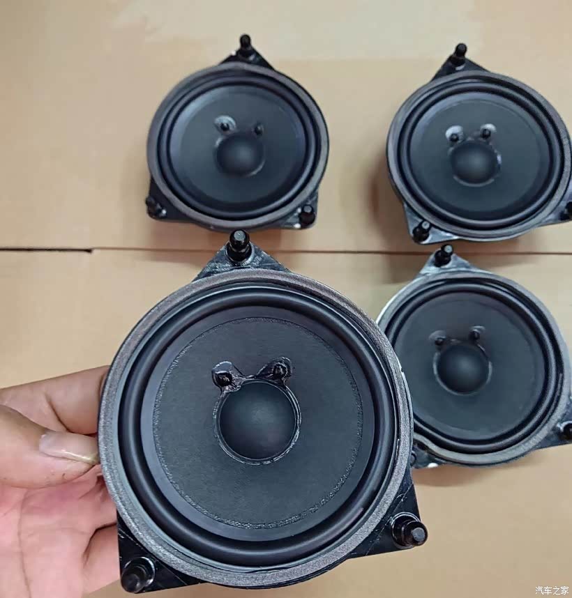 上图中左边最大的就是副驾的低音,右边空壳子是主驾的,中间五个喇叭是中音,其中四个一样的是在四门,最后一个略微大一些的是在中置。最下面是两个前门A柱附近的小高音。