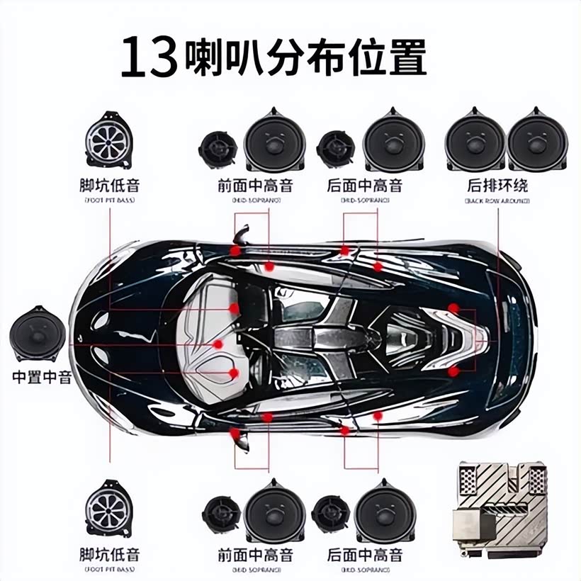 奔驰小柏林配置了13个扬声器,位置分别是中置中音1个,前门二高二中音,后门二高二中音,主副驾脚底两个超低音,D柱位置两个环绕中音。从名字就可以看出,柏林之声较原车标准系统,其实更多的是“环绕”,这体现在两个方面,一方面是增加了环绕喇叭(后门高音,后置物板环绕喇叭),另一方面是单独增加了小柏林功放,这个功放一共中置1路,四门4路,脚底2路,环绕2路9路输出。功率说是590瓦,实际上应该不是额定功率,估计是最大功率。后面比较小柏林喇叭和原车喇叭就知道猫腻了。