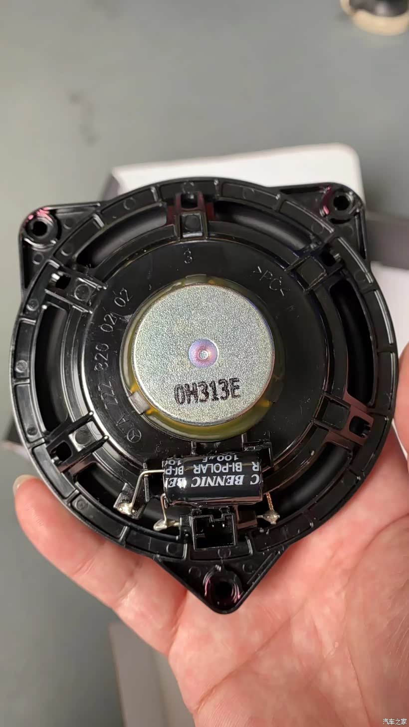 这是小柏林喇叭的背面,可以看出比原车标准系统的两个方面的提升,一个是磁铁换成了跟中置一样的小铷磁,另外分频电容的工艺更好。
