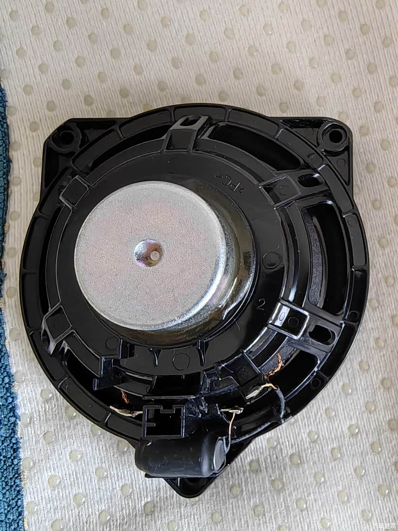 原车喇叭背面,从这里可以看的非常明显,四门中音和低音都不是铷磁的,而是普通的铁氧体磁铁。中置中音磁铁貌似是铷磁的,但是实在太小。基于这些信息,就知道原车喇叭耐受不了太大的功率。