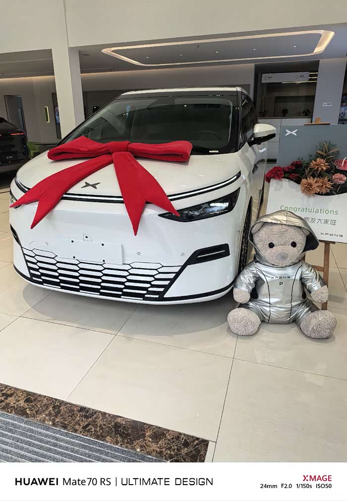 提车当天,小鹏4S店仪式感直接拉满!大白X9车头系着超大红蝴蝶结,旁边还有穿“宇航服”的可爱小熊,提车的时候,店里的工作人员全程热情,还很细心讲解功能细致,还帮我把极氪001上的一些小物件转移过来新车这边。下面是我提车之后的用车感受:
