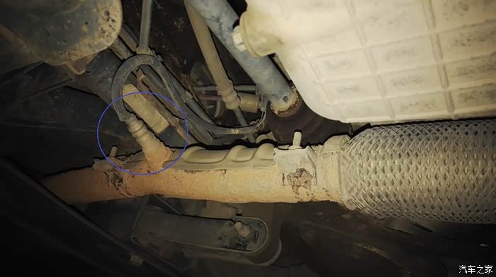 3. 一直以为后氧传感器在排气管尾端,技师告知在排气管近发动机处,此物一段有螺丝紧固到排气管上面, 另外一段是塑料接头,据技师介绍, 连接到排气管的部分内部是稀有金属, 当油品质量有问题的时候,会导致传感器损坏,我的到底是什么原因不得而知,(办了中石化的加油卡,从未在小加油站加油)附图: