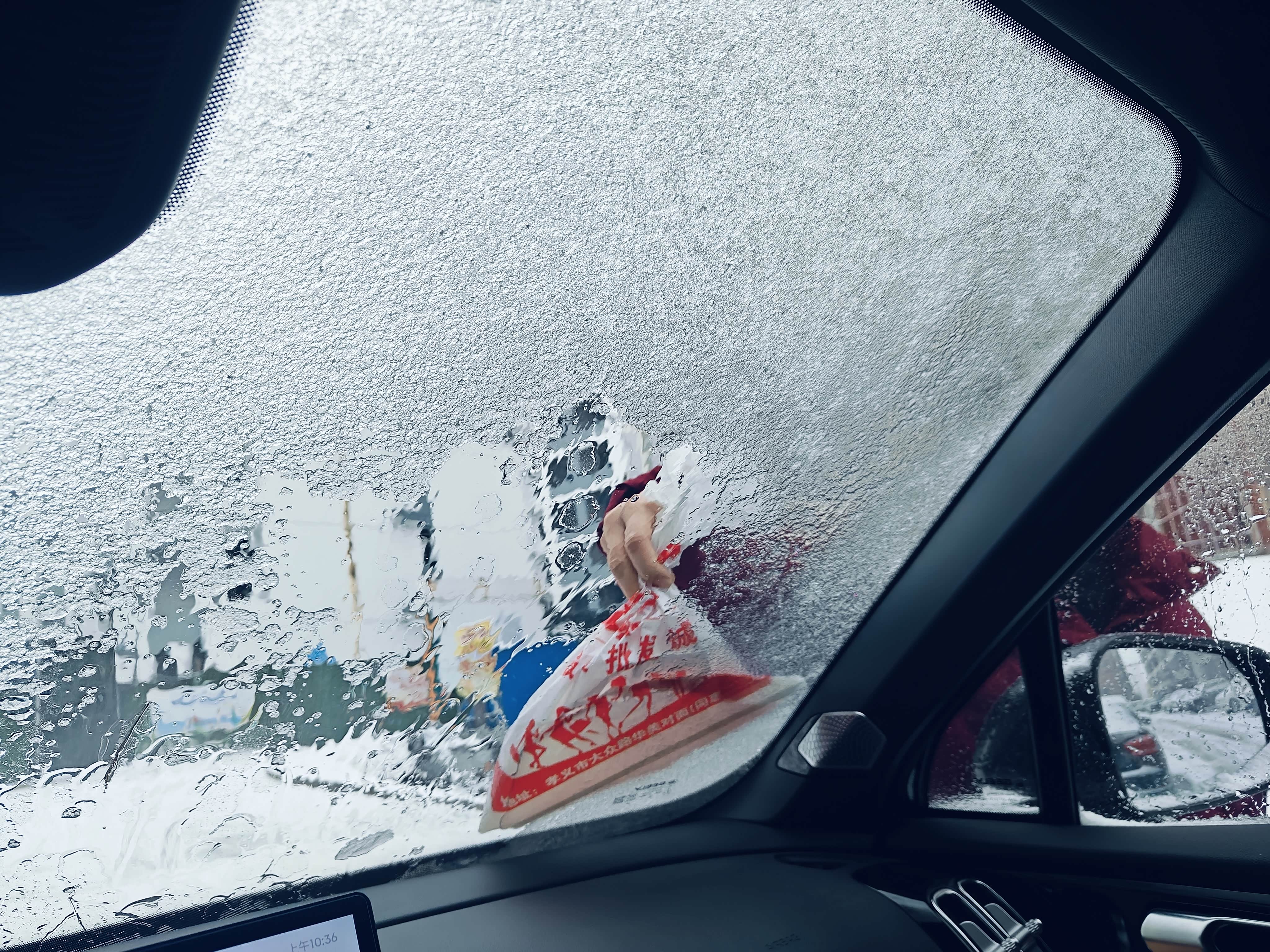 上车第一件事就是开热风除雾模式。没一会儿,冰就化了。