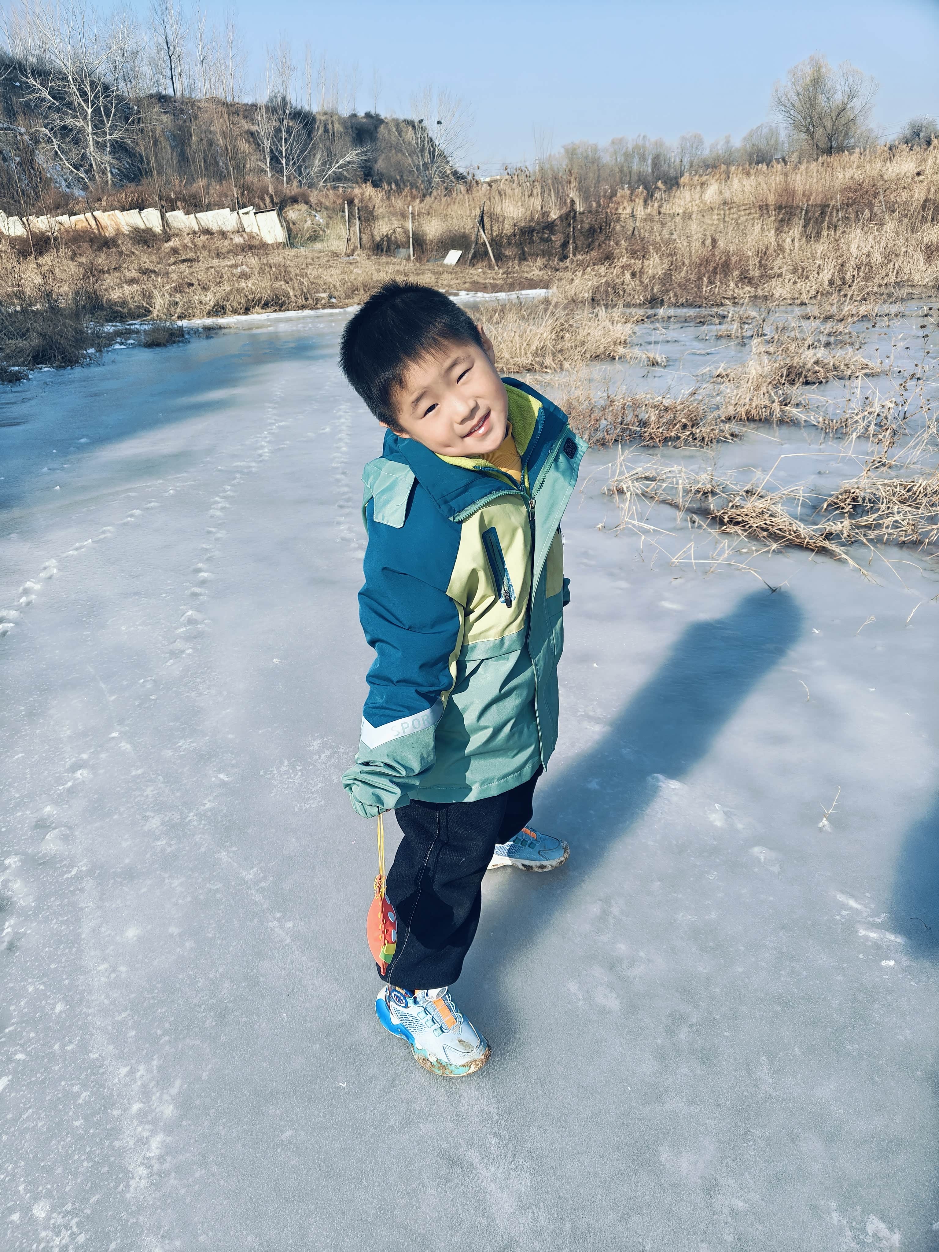 带小朋友去附近的池塘滑冰。原来计划把车也开上来滑一滑,但是后来发现冰比较浅,就不敢开了。