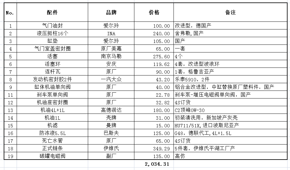 配件方面,主要换气门油封、活塞+改进的波浪环、液压挺柱,顺便换死亡水管。链条上次换过,但是总感觉专修给的假的,又花350买了个原厂德国伊维氏的。因为发动舱超级小,还提前买了空调膨胀阀,结果发现买错不能用,具体看另外帖子图片。所有清单详细如下
