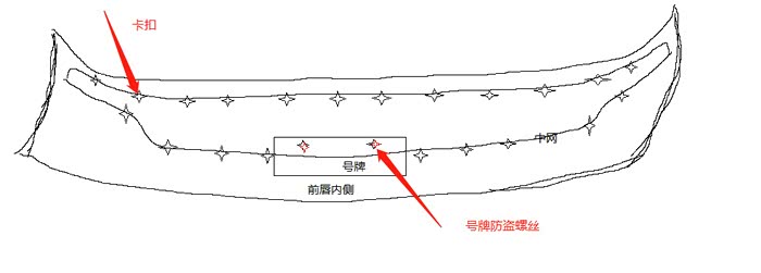 号牌防盗螺丝 图上得两颗是固定在中网上得,必须拆除,有准备签字之类得工具得话就可以了,没有得话可以向我一样直接废了中网。。。
