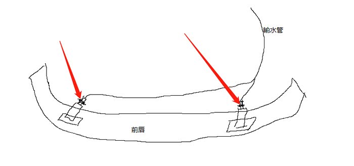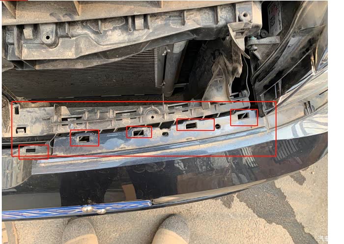 两侧拆开后基本上就下来了,注意前唇上连接了大灯玻璃水清洗装置,需要先手动拆除(红色箭头得地方是水管与装置得连接处,连接处两侧各有一个正方形按钮,同时按下就可以拆下来了,注意会流水哦,不要堵住水管,只让出水口高于玻璃水箱高度就行了)