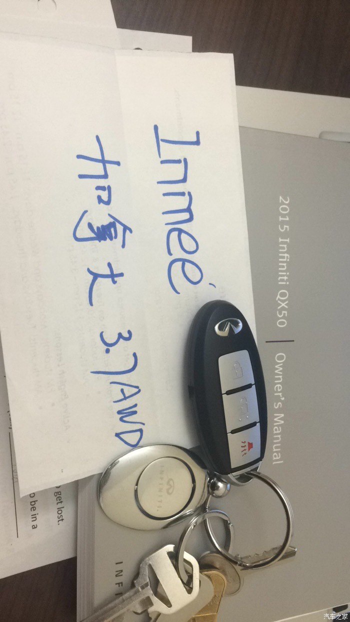 楼主是14年8月底来加拿大的。还没来的时候就和父亲说买车的事情。他说随便买个二手奇瑞扣扣什么的开开就好了,经济又实惠。当然只是开玩笑了的。等来了以后本打算熟悉熟悉情况12月份放假把车买了的。可是12月回国享受我大***的美食去了。哈哈哈!于是乎楼主一月份一回来就去店里看车去了。老爹也没说给多少钱,就让自己去看车看好了打电话跟他报就好了。但是楼主自己心里有数家里不是很有钱的。选车时候就没有往太好车上去看。最开始看了BMW的3系。试驾感觉悬挂太硬不喜欢那种感觉,而且方向盘太重。偏向于运动的调校,就果断pass了。后来又去试了试大奔的cla,gla以及glk等车型感觉都不是特别满意。逛着逛着就神不知鬼不觉的来到了Infiniti。当然还是那句广告让我想起了英菲尼迪的存在:亲爱的观众朋友们,这里是有英菲尼迪赞助播出的爸爸去哪儿。。。。。。