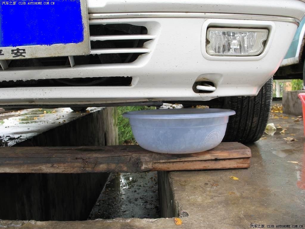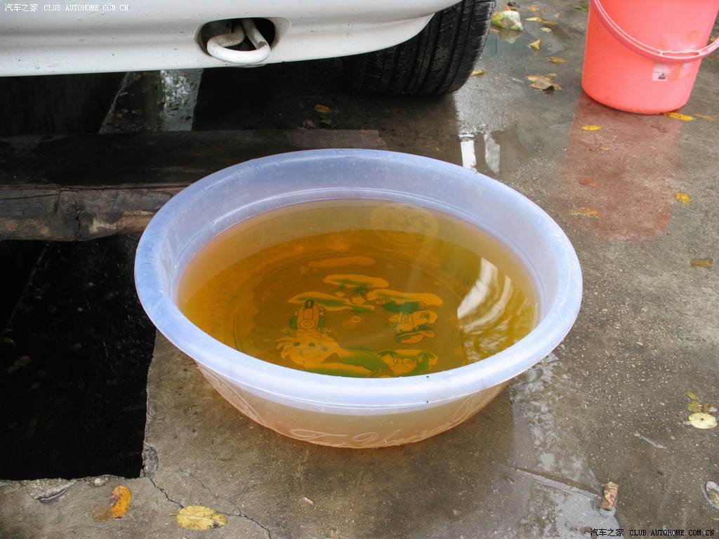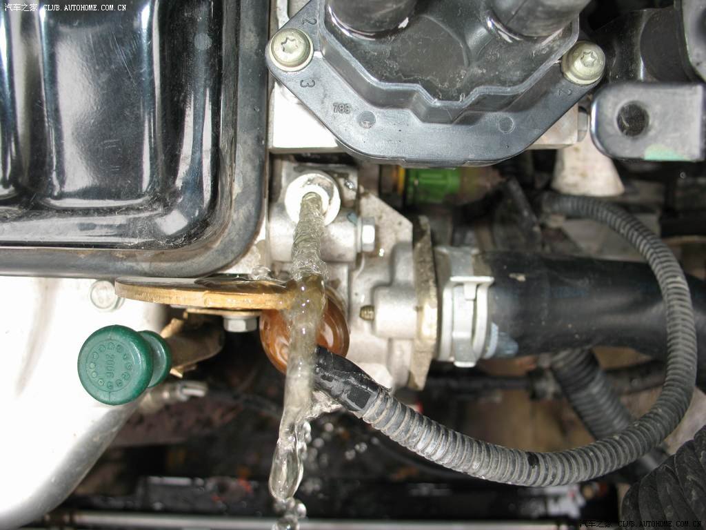 9、启动发动机(不要盖上副水箱盖),怠速运行三十分钟,(不要心疼油!我今天换防冻液至少耗了2升汽油)为了使水在整个冷却系统反复循环,循环清洗水箱、水泵和水道等各部件。三十分钟后按照前面介绍的方法将系统中的冷却水排放干净。重复上面的过程,直到排出的冷却水干净透明,没有任何污物,旧冷却剂被彻底清洗干净为止。放水时注意烫伤手!!!大家看啊,放出来的水温度很高,已是烟雾沉沉!