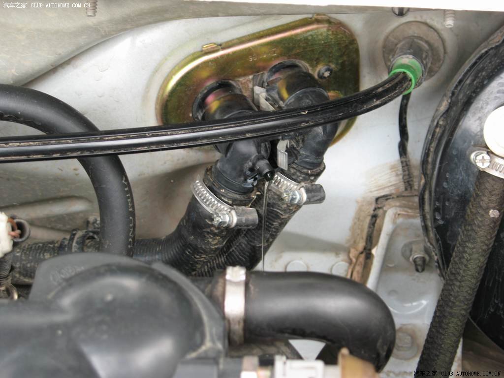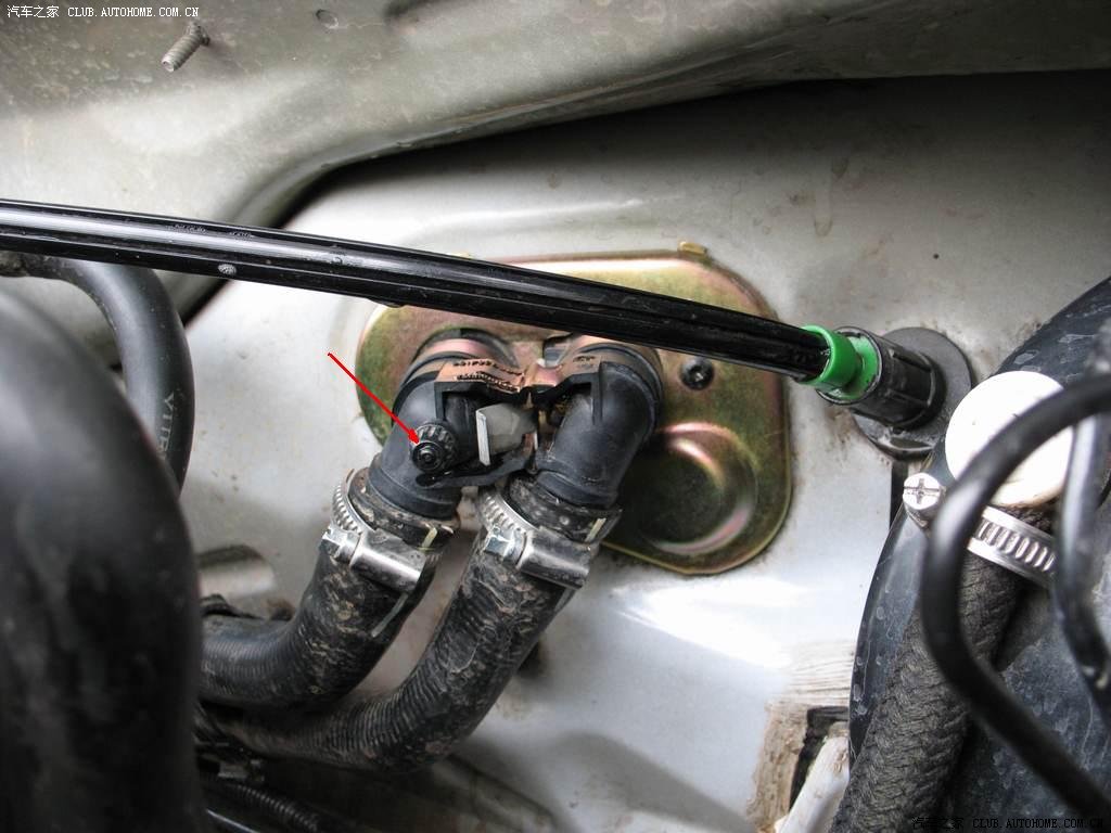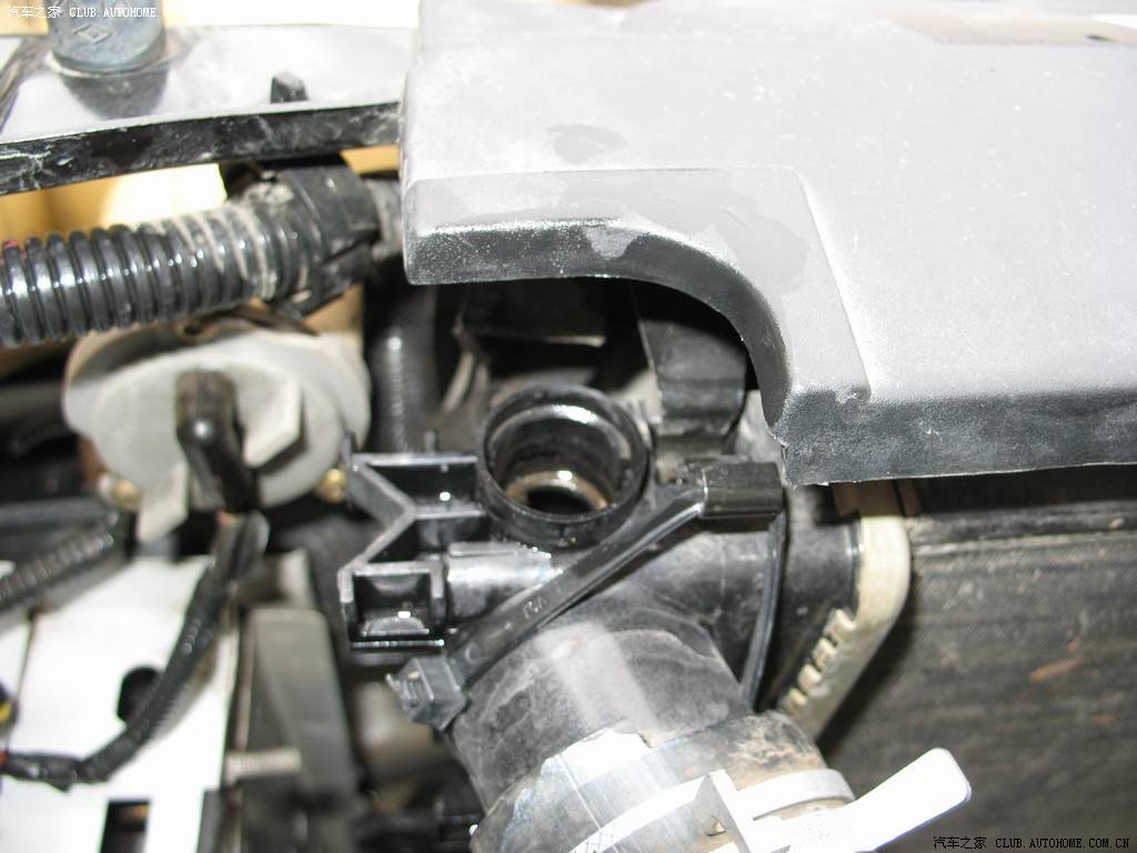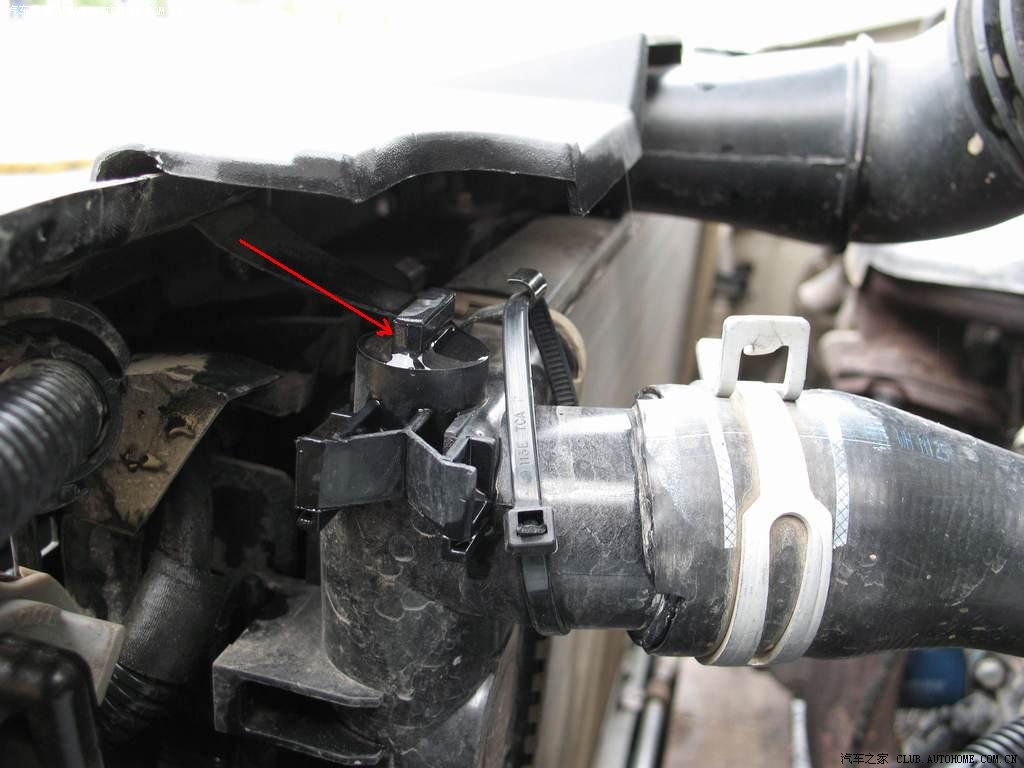 6、找到排气位置,除了副水箱注水口,富康车还有三个排空气阀门,一个在驾驶舱壁水管上;另一位于发动机右侧的节温器附近;还有就是水箱顶部右侧的排气阀。