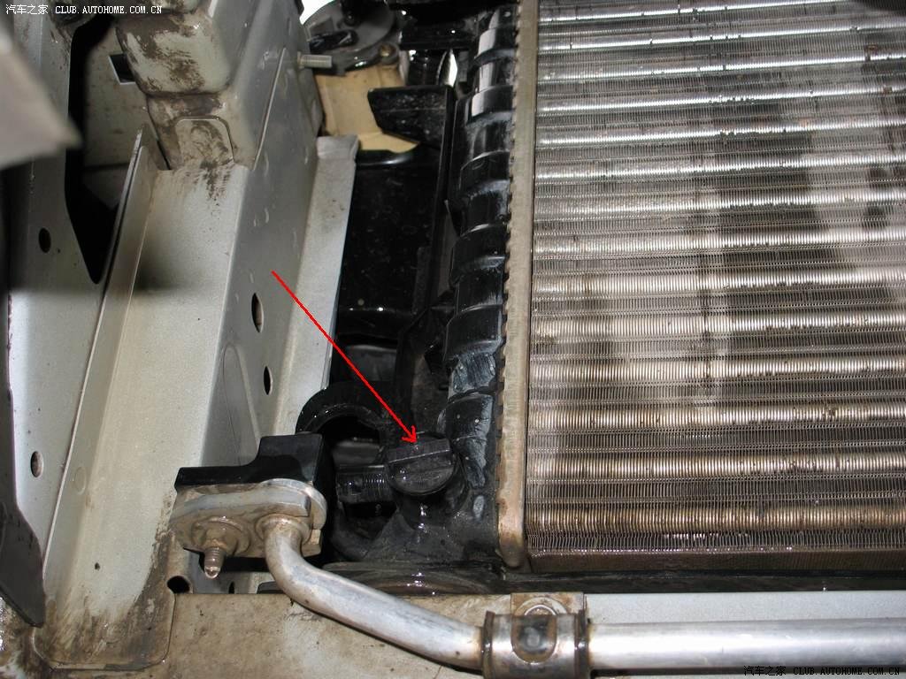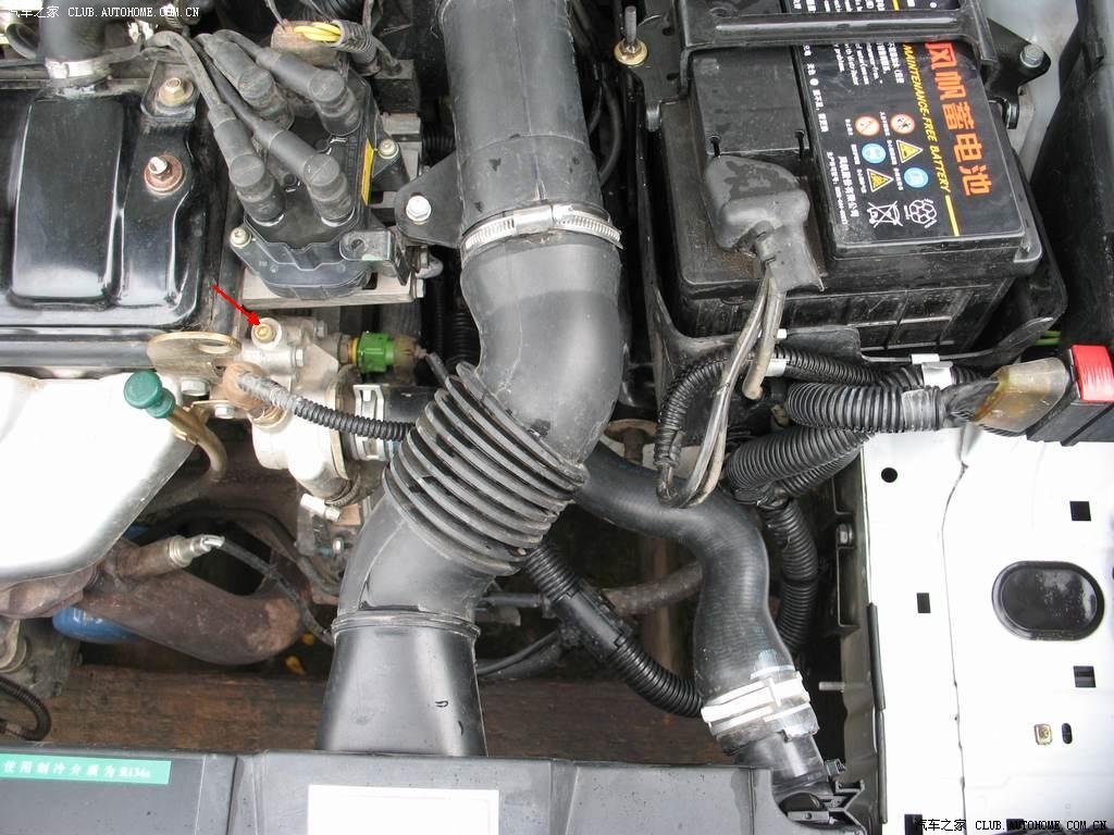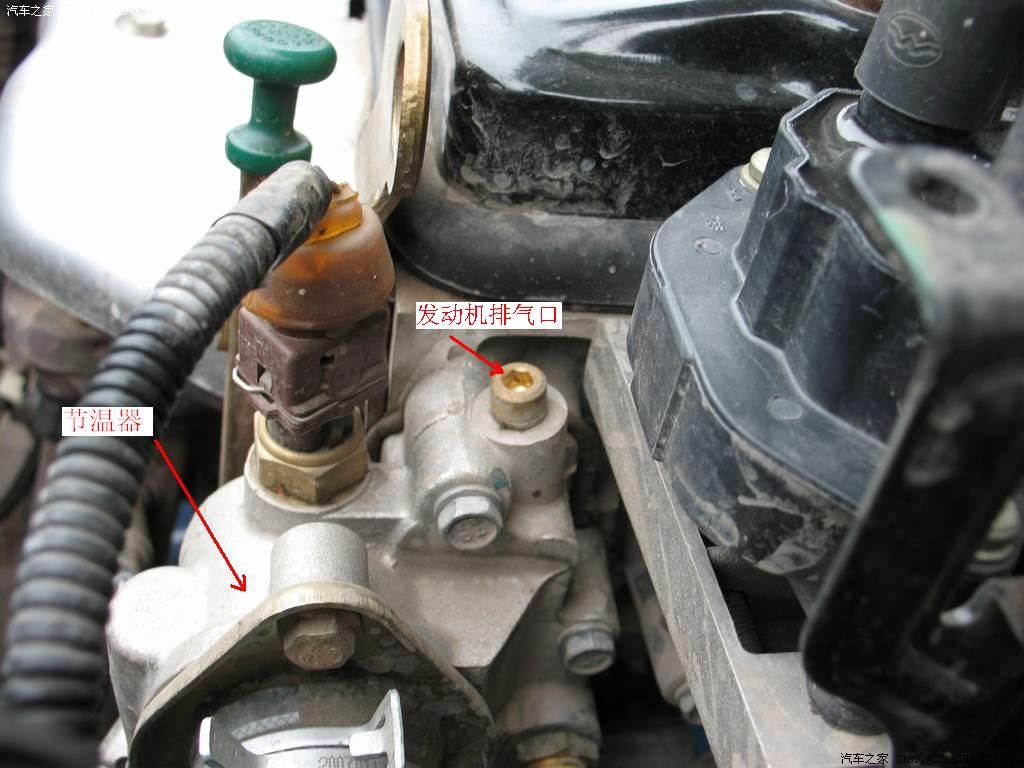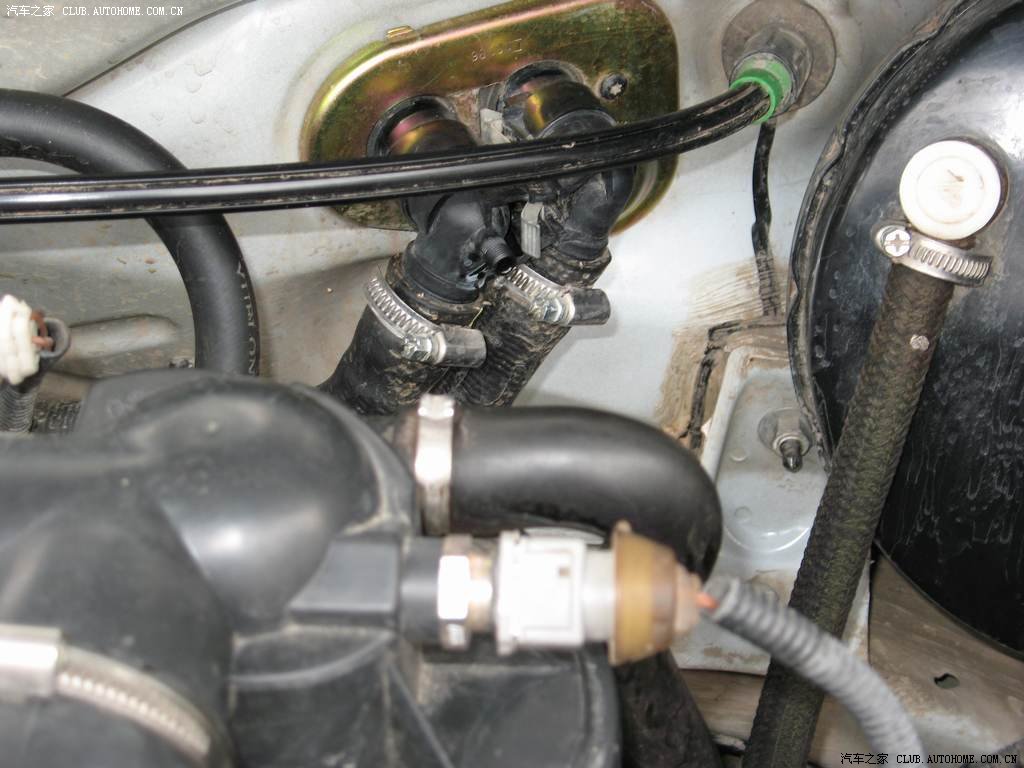 6、找到排气位置,除了副水箱注水口,富康车还有三个排空气阀门,一个在驾驶舱壁水管上;另一位于发动机右侧的节温器附近;还有就是水箱顶部右侧的排气阀。