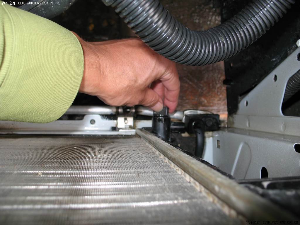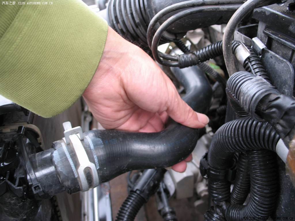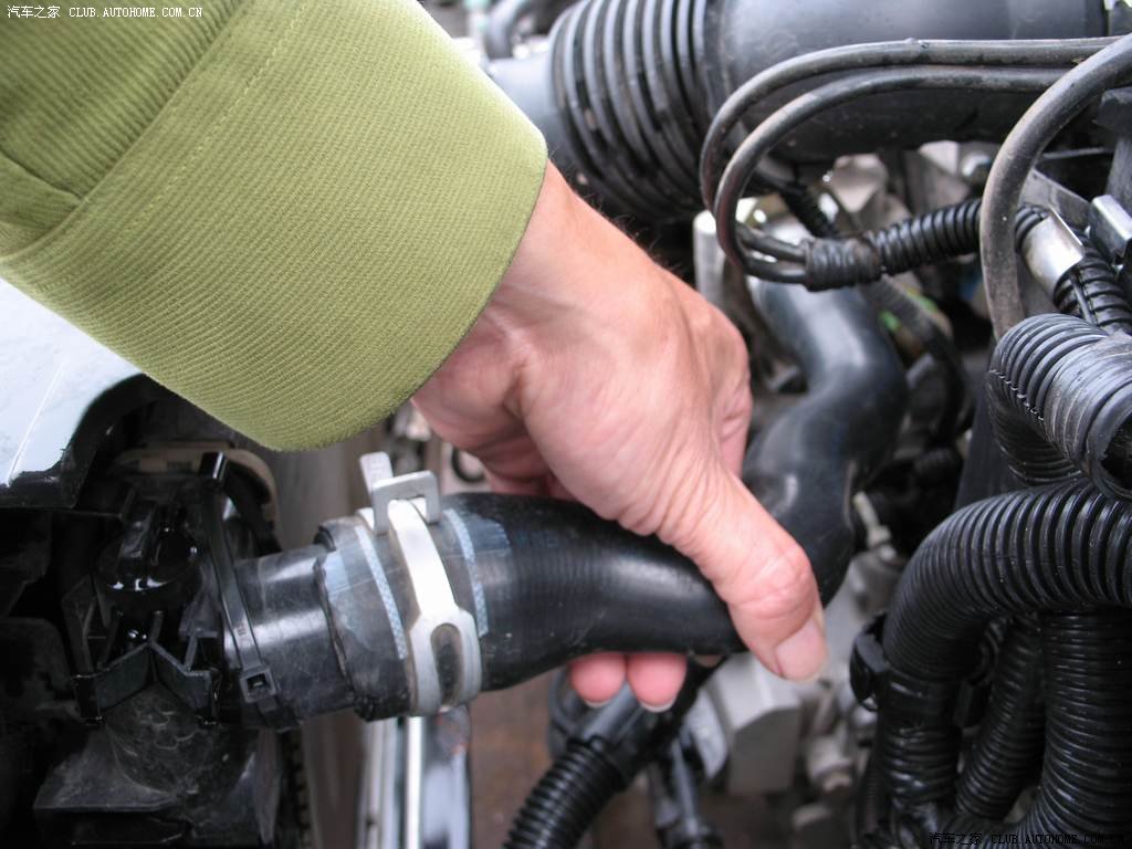 3、发动车子,15分钟以上,以确保节温器打开。冷却系有2个循环,平时车温不到80度时节温器关闭冷却液只在小循环循环流动,以利于机体温度早点趋于正常,一旦到90度以上时节温器打开,大循环工作,如长时间怠速或空气流动性差,又会打开风扇强制冷却。正确判断节温器是否打开的方法是用手摸发动机出水管,而不是看水温表。温度很高时说明节温器打开了。如果节温器未打开,只能放出大循环中的冷却液。大循环工作后将空调打到热风位置,使内部循环起来。