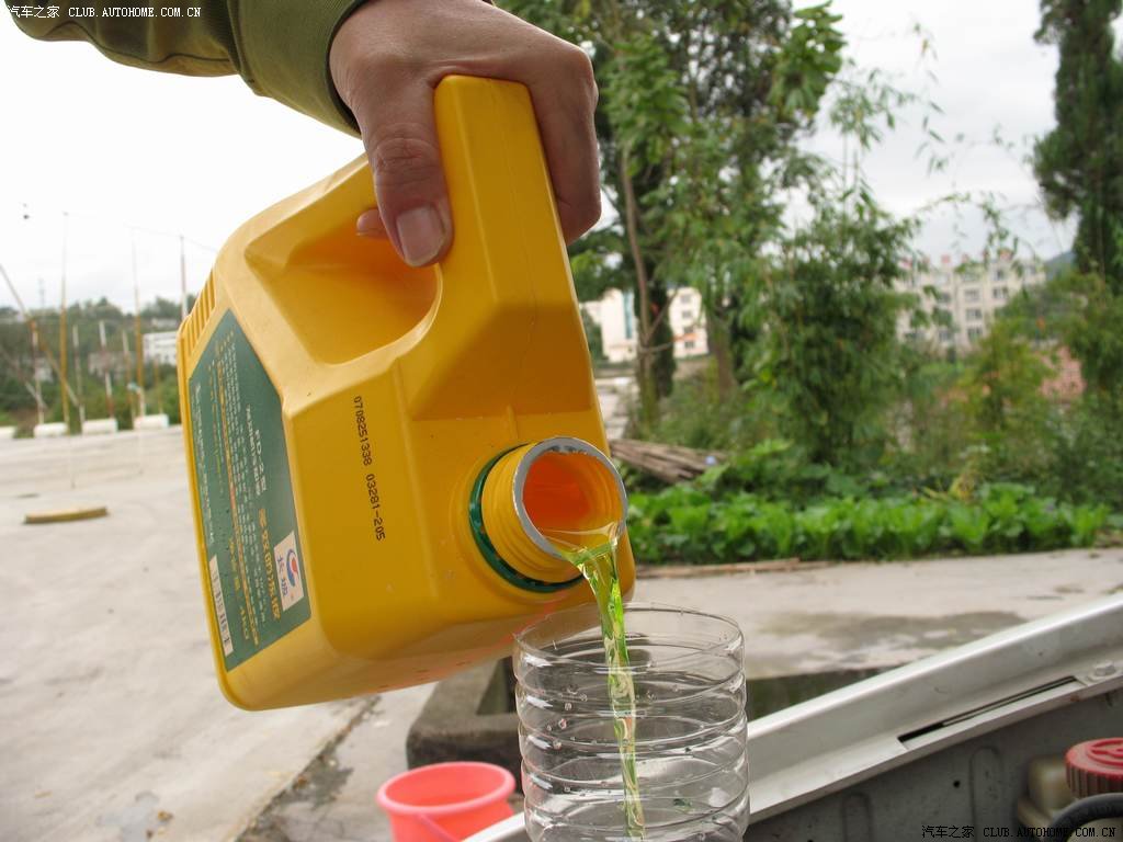 4、熄火,赶紧松开水箱放水阀(左旋半圈往外拉),把旧防冻液放掉,注意烫伤手!!!放水同时打开水箱顶部右边的排气阀(左旋半圈往上拉)。放出的防冻液的原厂防冻液,颜色已经成土黄色的。此外,有强烈的刺鼻气味,估计差不多已经失效了看来原厂的防冻液质量也不怎么样。