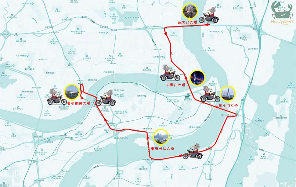 细心的我早已为今天的行程做好了规划,从弹子石出发经过朝天门大桥,途经千厮门、东水门、长江大桥、渝澳大桥。