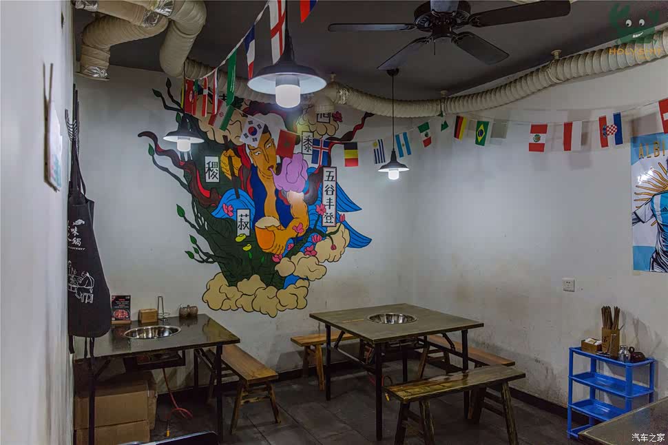 不大的房间里,摆放着几张桌子。未经装修,只是墙上的涂鸦体现着重庆的特色文化。