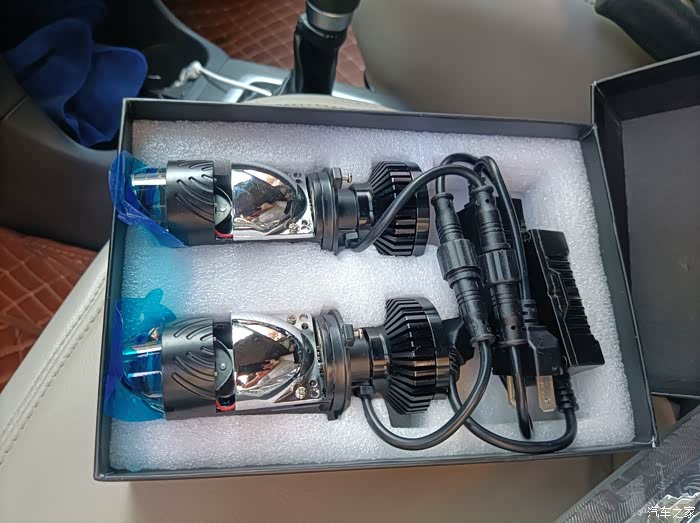 拆掉了两个大灯灯腔内的小反光碗,接着就是给这两个大灯安装新的小透镜灯泡了。这次的灯泡选用了,带玻璃透镜的LED灯泡,透镜上面也带变光电机,LED光源,看介绍使用还是非常不错的。看着这两个led灯泡,做工还是挺不错的。商家质保三年。