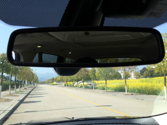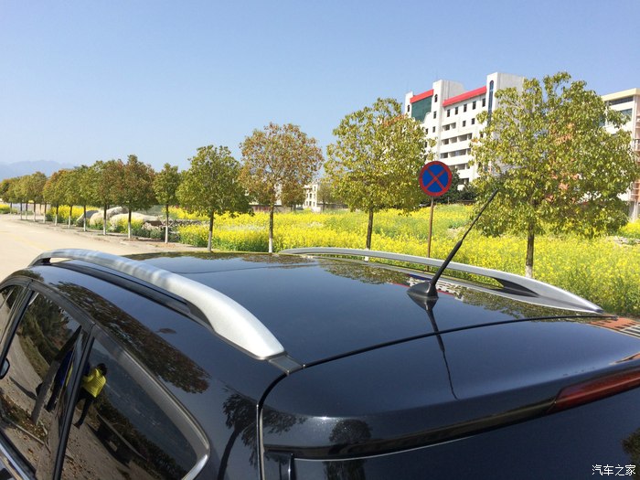 车顶全景天窗和行李架以及小小的一片油菜花。