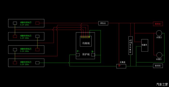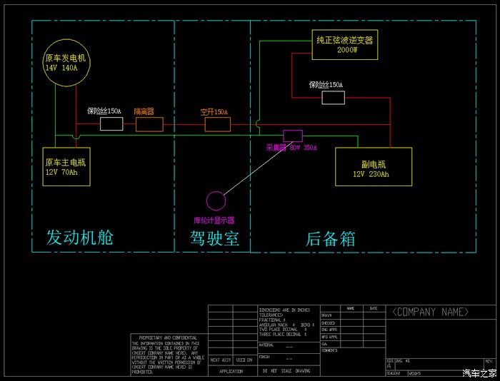 附上电路接线图,我查看过了宋MAX的发电机是14V 140A的,充电功率可以满足充电。空开在副驾驶座椅右侧下面,库仑计放在副驾驶右侧的小三角窗旁,不影响视线,采集器和保险丝被我设计安装在副电瓶的不锈钢箱子里面了,整洁、不经常碰到少出问题。