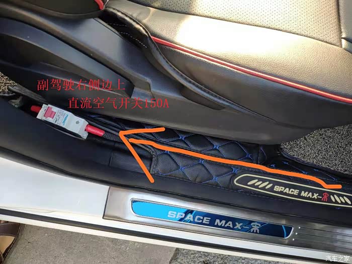 副驾驶右侧边下方,安装直流空气开关150A,控制红色的正极线,开车时观察库仑计充电情况,如果充满了,就叫老婆关掉,平时停车的时候,也可以断开,更安全。