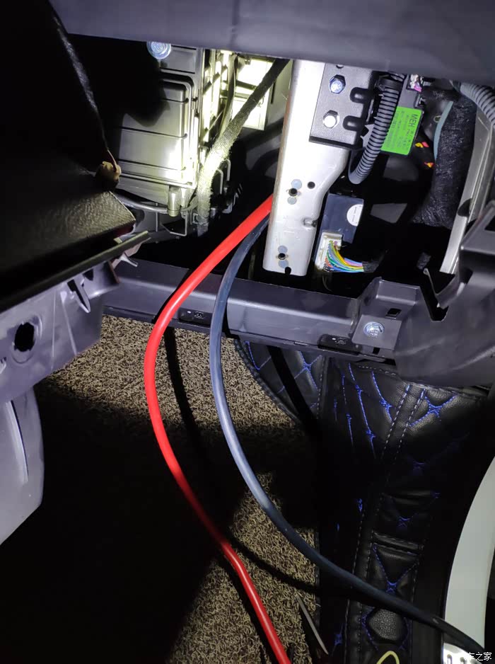 从左侧副驾驶下面有个胶塞穿线的地方,用螺丝刀捅穿2个孔,费了九牛二虎之力才把2根线穿过去。很多人说,0V线其实不用穿,在尾箱找个地方搭铁就行,可以省一百多线材的钱。但是车子原本很多电器件和传感器都是搭铁的,担心充电时的大电流经过车身会对这些电器件造成干扰,影响原车电器的稳定性,所以还是单独拉(拉好后,要穿阻燃尼龙编织网管,发动机舱的部分还要穿汽车专用阻燃波纹管保护)。