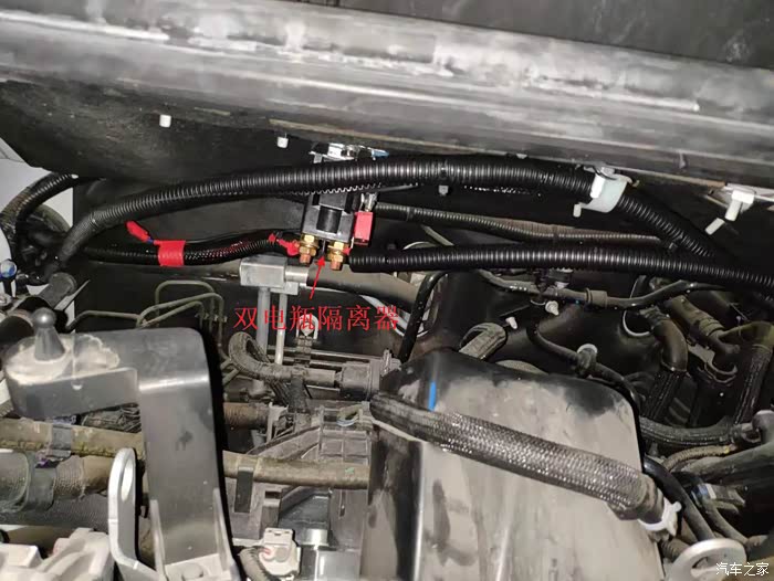 双电瓶隔离器固定在中控台下面的机舱里面,原车预留了很多螺丝,找一个空旷的地方安装固定好: