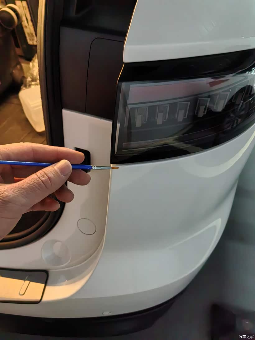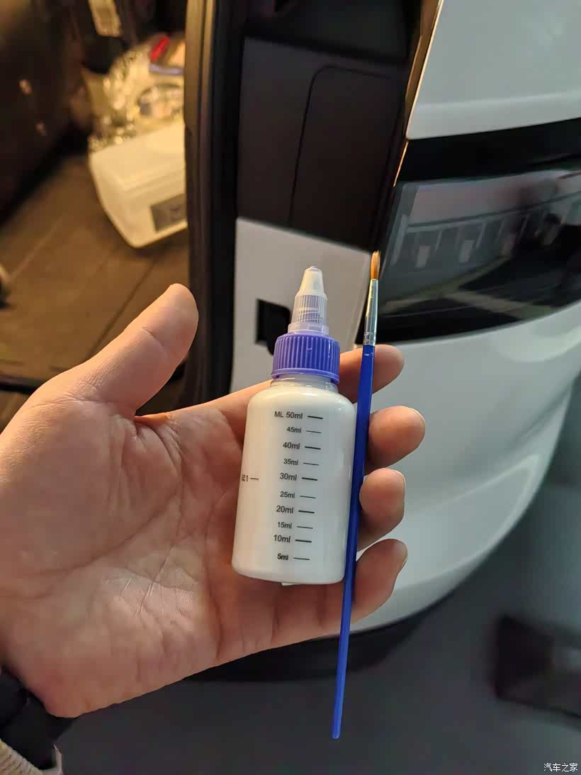 之后我又把全车检查了一遍,发现尾灯下方有一处掉漆,应该是被小石子崩的。我翻出上次去售后时,师傅给的一小点白色补漆,拿支小号毛笔,对着掉漆的地方细细描了几下,不仔细看根本发现不了痕迹。