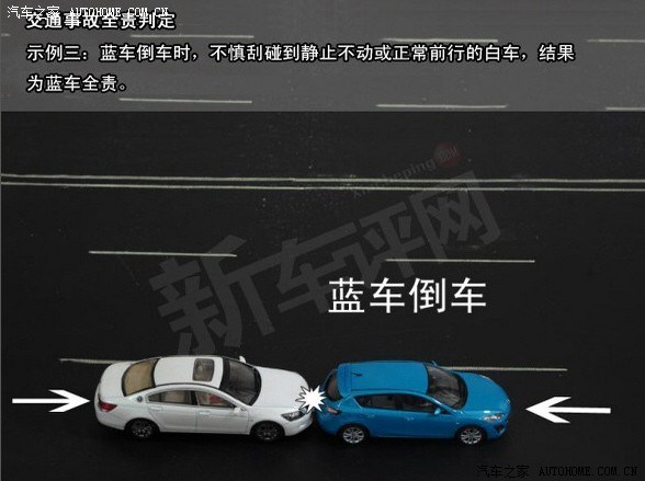 示例三:在正常行驶道路或路边临时停车位出现前车倒车刮碰到后车的情况,过错与责任显然全在前车。如图所示,白车在正常前行,蓝车此时进行倒车导致事故发生(白车被追尾),全责方是蓝车。