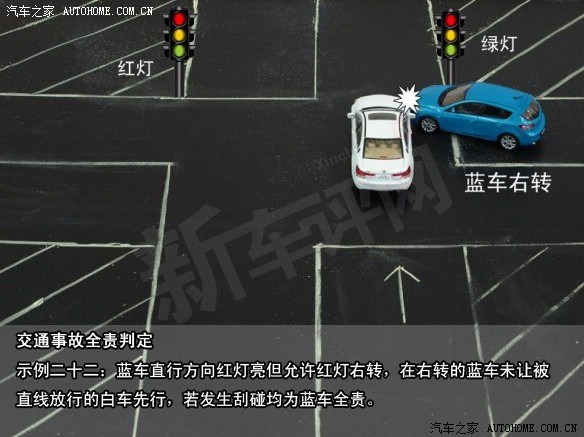 示例二十二:蓝车直行方向为红灯,不过允许红灯右转,但仍需让被直线放行的车辆先行。如图所示,蓝车并未让被直线放行的白车先走,并且与之发生刮碰事故,该情况下由蓝车承担全部责任。