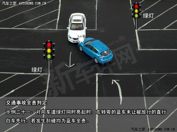 示例二十一:相对车道绿灯同时亮起时,左转弯车需让直行车先行。如图所示,蓝车并未遵守行驶规定,致使与白车发生刮碰事故,责任由蓝车全部承担。