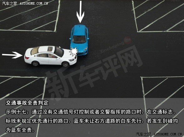 示例十七:在通过没有任何标识的路口时,若右方道路同时也有车辆驶出,应让其先行。如图所示,正常情况下蓝车需让白车先行,不过蓝车并没有那么做,最后导致事故发生的全部责任则都归蓝车所有。