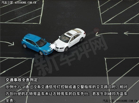 示例十八:在没有任何交通指示的情况下通过路口,相对方向的右转弯车需让左转弯车先行。如图所示,蓝车正在右转,白车正在左转,但蓝车并没有作出让行致使刮碰事故发生,事故责任将由蓝车全部承担。