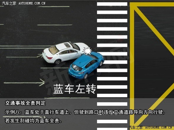 示例八:所有机动车驾驶员选择驾驶方向时应提前做好准备,正常情况下在接近路口时已驶入需转向的车道上,并按照箭头指示方向行驶。如图所示,蓝车可能无意错失进入转向车道的机会,或者本身有意在直行道上转弯,最后导致与正常行驶的白车发生刮碰,事故发生后所有责任则由蓝车承担。