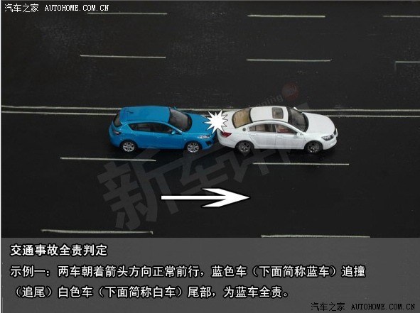 示例一:如图中所示,蓝车与白车正同向行驶,但因蓝车与白车之间的距离太近,或者蓝车速度太快,导致在白车刹车制动后自身得不到充分的制动时间和距离,从而令事故发生。出现追尾事故,都为后车全责。