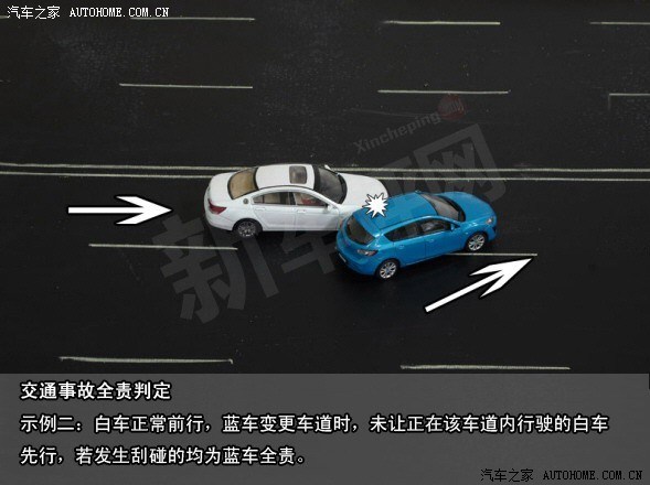 示例十:机动车道上画有实线的路段是严禁跨越的。如图所示,蓝车违反相关规定跨越实线,试图并入白车车道过程中不慎与白车发生刮碰事故,结果由蓝车全部承担。