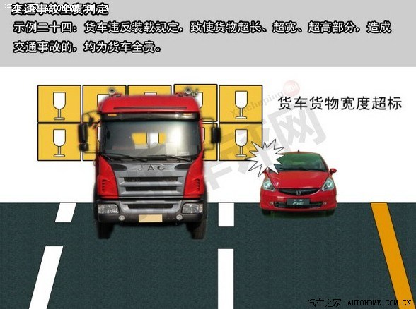 示例二十四:货车违反装载规定,致使货物超长、超宽、超高部分,造成交通事故(例如货物刮碰到旁道的车辆),均由货车承担所有责任。
