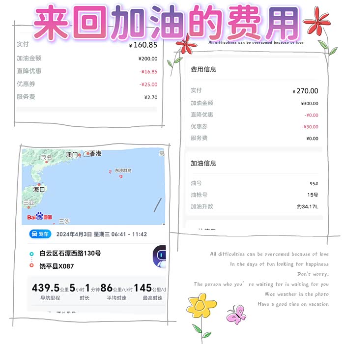 油耗表现:全程高速大概400公里,时速大概在100-120公里/小时,城市与乡村道路基本在50-70公里/小时,综全油耗在:6.2/100km, 平均86公里/小时。 95#汽油是8.49元,0.0849*6.2=0.526 每公里大概=0.52元 0.52*486=252.72 油费总共用了:252.72元。