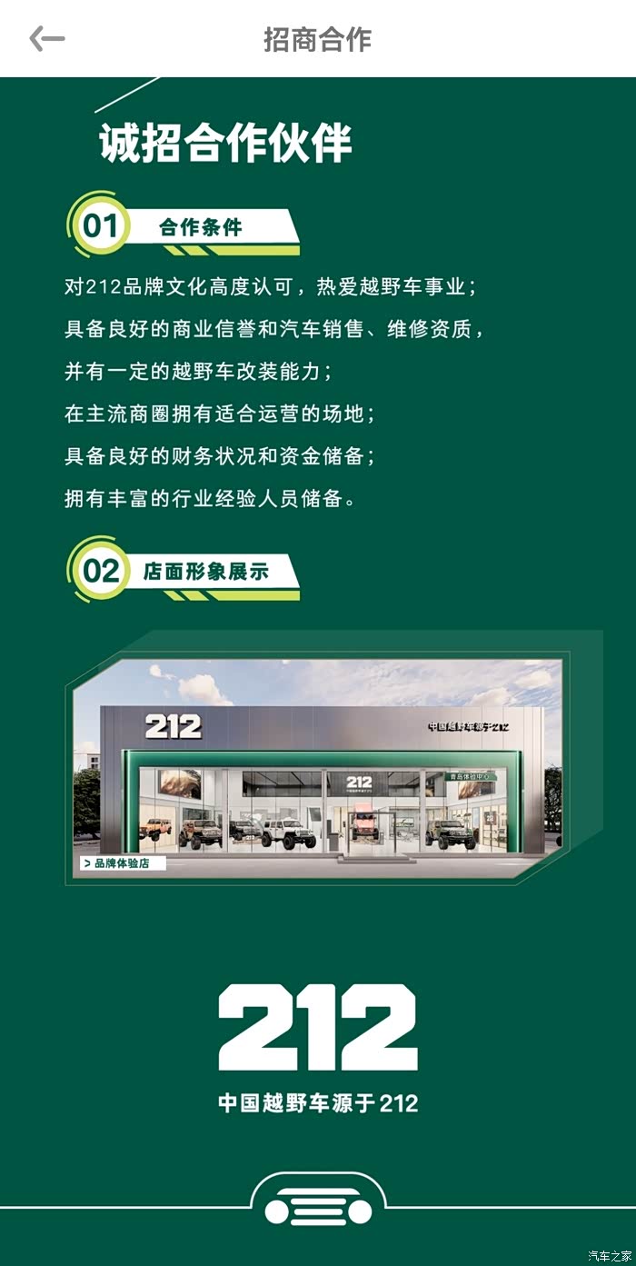 合作过或有相关经验的各地经销商,可申请跟212优先达成直销协议,门店改造标准化,不需要销售人员,产品参数、配件、价格等信息一律线上标明,一律线上选配,线下只提供交付、保养、维修、改装等服务。