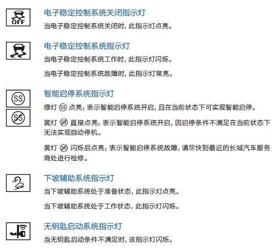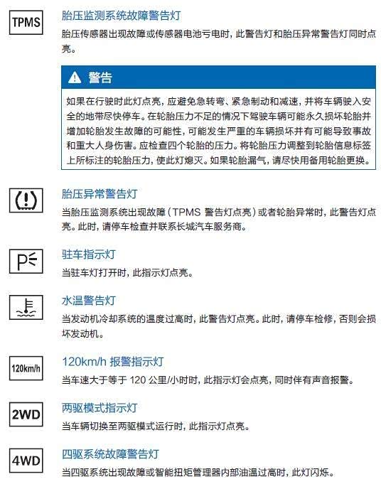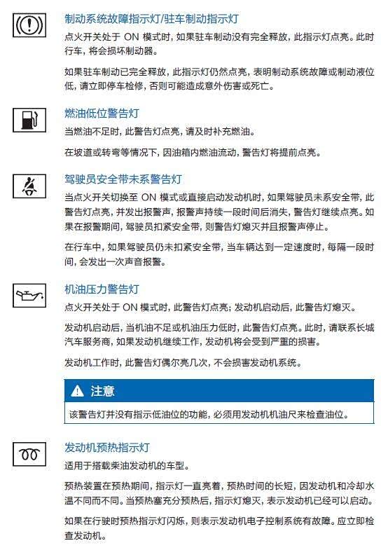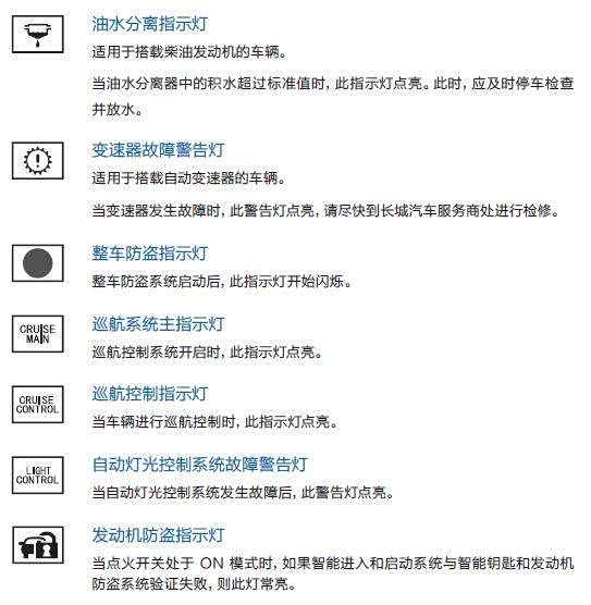 9、发动机维修警告灯:当发动机存在非排放方面的故障时,此警告灯点亮。此时,请联系长城汽车服务商。