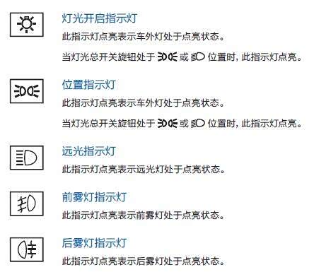7、前雾灯指示:灯此指示灯点亮表示前雾灯处于点亮状态。