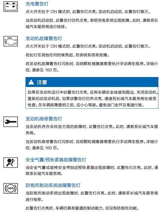 11、防抱死制动系统故障警告灯:当防抱死制动系统出现故障时,此警告灯点亮。此时,请联系长城汽车服务商进行检修。