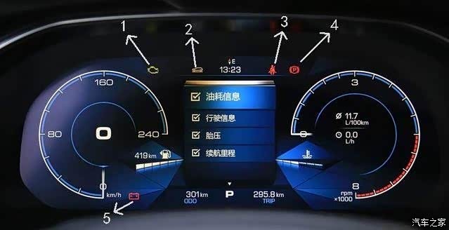 4、驻车制动指示灯:点火开关处于 ON 模式时,如果驻车制动没有完全释放,此指示灯点亮。此时行车,将会损坏制动器。
