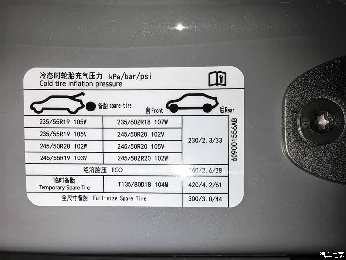 - 前胎:因轮毂尺寸(18/19/20寸)和胎宽(235/245mm)差异,前胎规格细分四类(如235/60ZR18 107W、245/50R20 102V等)。车主需查看轮胎侧壁标识,匹配对应行的前胎规格,确保胎压适配。