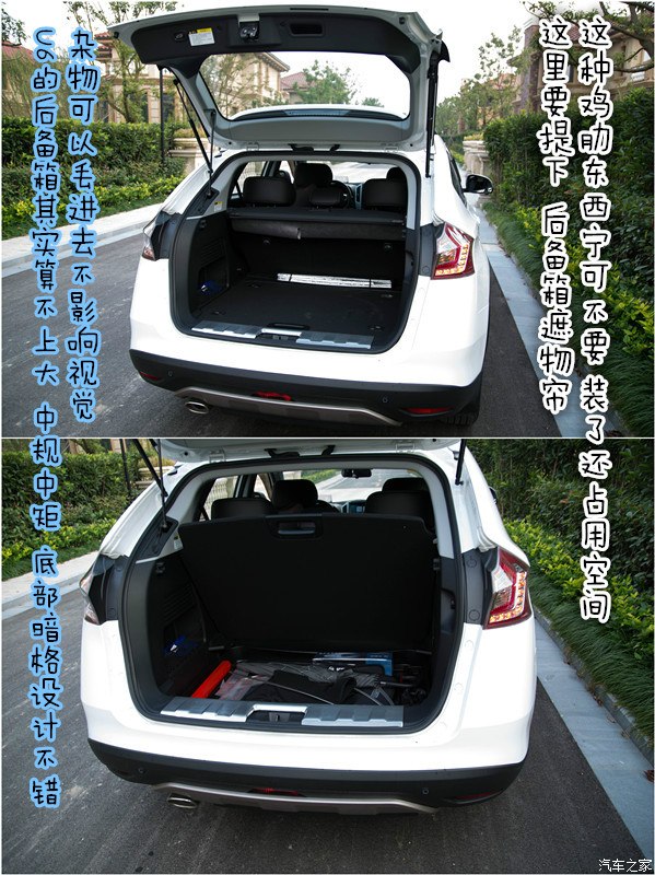 操控:U6采用的是液压助力,从刚上手的感觉来说很重!原地打方向吃奶的劲都用上了…(我才96斤 前头后排坐三个人 其中一个就是我ˊ_>ˋ)方向盘大概有左右5度的虚位,在这个角度里转方向盘轮胎是不动的,不过纳智捷在方向   机的调配有很大的进步,老大7、mpv、纳5虚位角度更大,左右来回超车方向盘回馈路感很直接,液压助力好处就是高速、来回变道、对路感回馈更直接,缺点就是娘的低速时真是好重!电子助力好处就是低速轻盈,弊端就是虚位角度会相对更大点,路面回馈感相对弱一点!(个人观点 勿喷)