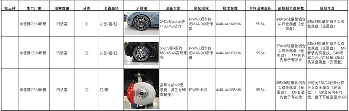 (3)布雷博的MP四活塞卡钳,各种称呼都有,什么M40i,MSP,MP,还有号称M40i和MP不一样的,其实就是一毛一样的,整体来说,其实就是只有3款不同尺寸的卡钳,分别有不同的配色,为了方便称呼,我就称呼为348MP卡钳,374MP卡钳,395MP卡钳。