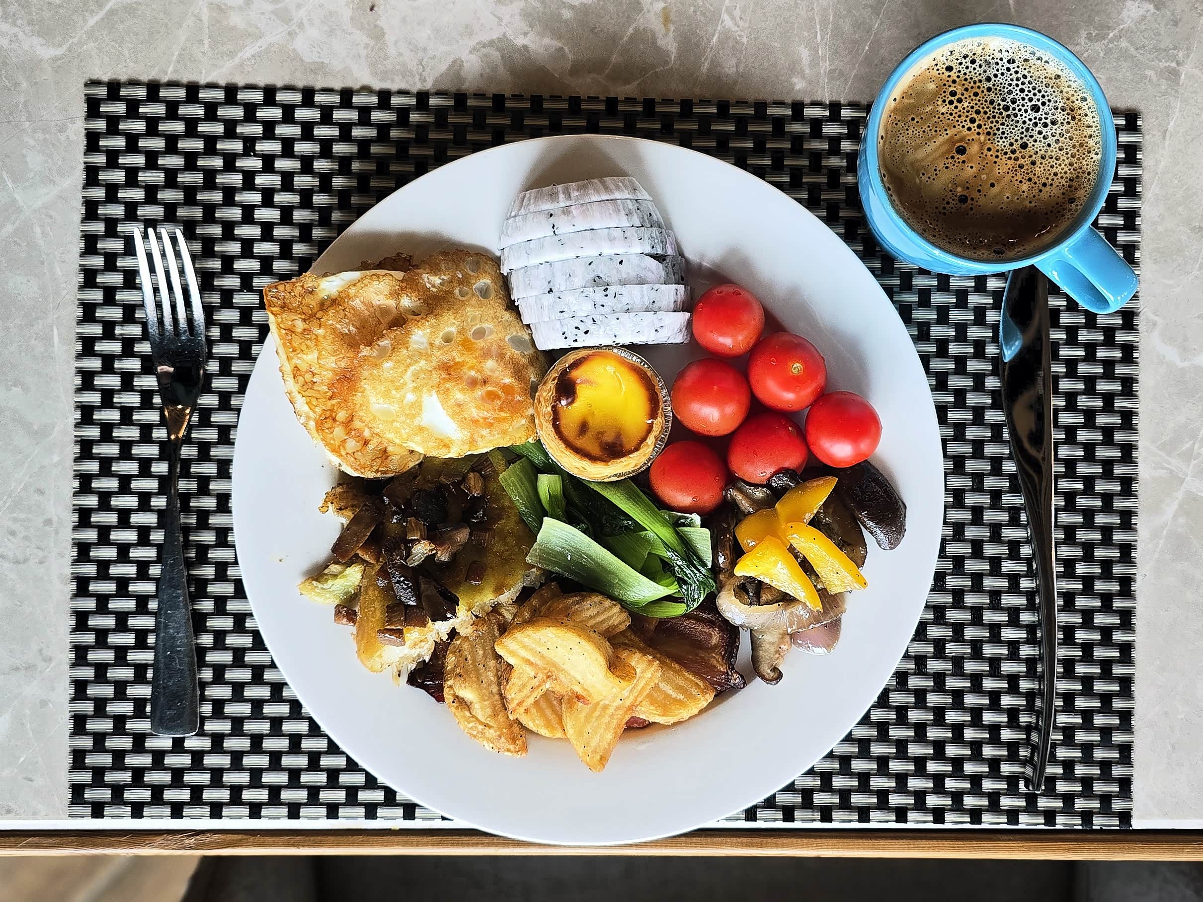 第二天照例起床空腹有氧,工作日早晨的泳池果然人很少,水质清澈空无一人,简直就是梦中情池。结束后回屋子泡个热水澡放松一下,擦干去餐厅吃个brunch,一天的行程就此开启!
