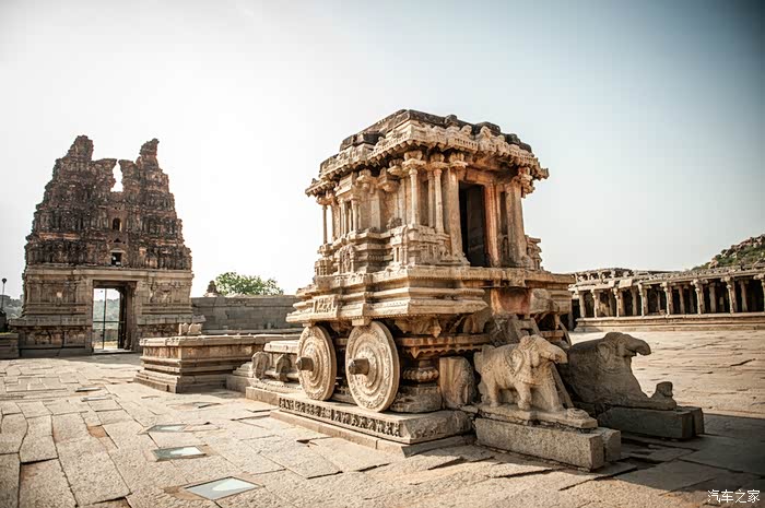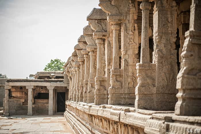 沿着河走,一路的巨石上有神像的浮雕,岁月冲刷已经接近模糊。两公里外的Vittala神庙汇聚了毗奢耶那伽罗王朝建筑艺术的精华,庙里的石雕战车历经500年风雨,石轮依旧可以转动。