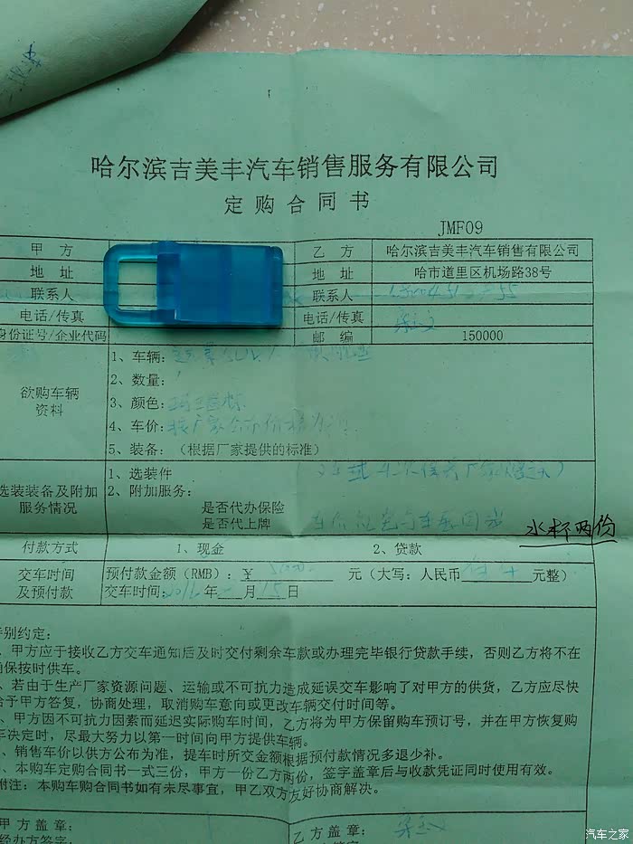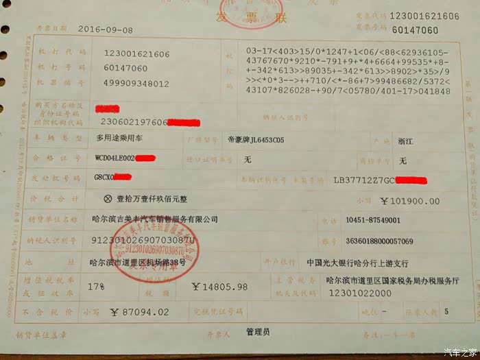 然后就是回家等待。8月4号我和朋友开着他新买的博越去牡丹江的小九寨去玩,我们早上走的,中午4S店的销售通知我,说远景SUV车到店了,可以安预售价10.39万提车了。我和销售说,我在外地旅游,先不提车了,等上市后,安上市价格提车。后来8月28日上市,因母亲住院,当天也没去提车。后来销售告诉我上市的第一批车都提走了,现在没车了,你在等几天,等第二批车吧!9月7号销售通知车到店了,来提车吧!