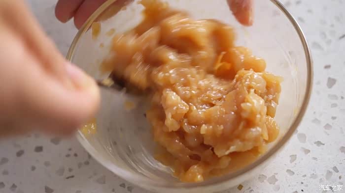 - step 2 -鸡胸肉用刀剁碎,加入生抽、白胡椒、玉米淀粉、料酒、香油拌匀