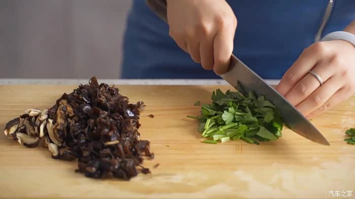 - step 4 -泡好的香菇切丝,木耳和香菜切碎,一小块姜磨成姜泥