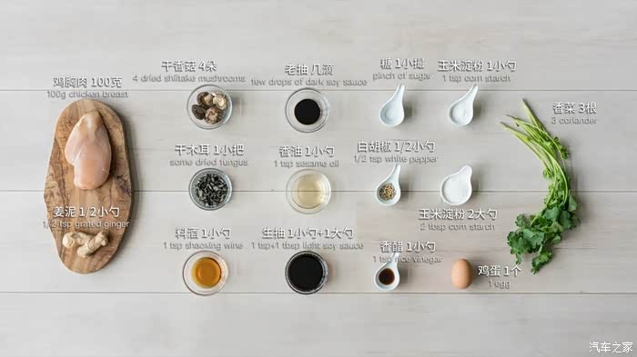 鸡胸肉100g,姜泥1/2小勺,干香菇4朵,干木耳1小把,料酒1小勺,老抽几滴,香油1小勺,生抽1小勺+1大勺,糖1小撮,白胡椒1/2小勺,香醋1小勺,玉米淀粉1小勺,玉米淀粉2大勺,鸡蛋1个,香菜3根